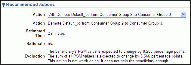 You can select different recommendations using the Action drop-down list. Oracle Database QoS Management tries to provide the best recommendation to the QoS administrator, but you might decide that a different action would produce better results. If you select a different action, then the information in the Recommendation Actions and the Situation Analysis sections are updated to reflect the impact of the alternate recommendation. You cannot implement an alternate recommendation if that recommendation has been rejected by the Oracle Database QoS Management System for not providing enough benefit to the system as a whole.
