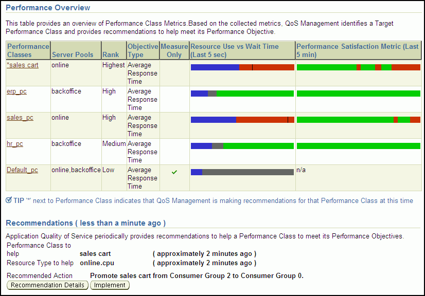 If the Performance Classes are meeting their Performance Objective, then a recommendation is displayed which states "No action required: all Performance Objectives are being met." If Oracle Database QoS Management determines that a Performance Class is not meeting its Performance Objective and has a recommended action for improving performance, then the Dashboard places an asterisk ('*') in front of the Performance Class name in the Performance Overview chart and displays a Recommended Action. If more than one Performance Class is not meeting its Performance Objective as shown in Figure 4-1, then only the target Performance Class displays an asterisk and a recommendation. If the recommendation has an associated action, then an Implement button appears, which you can click to have the action implemented.