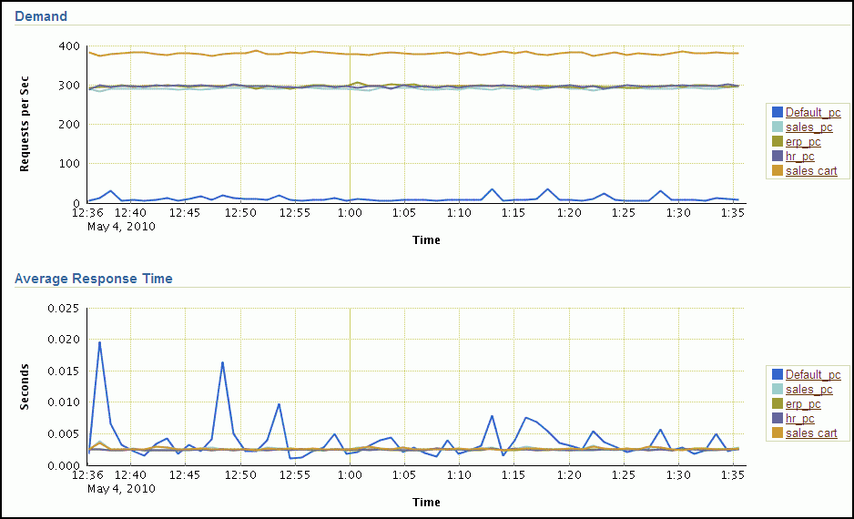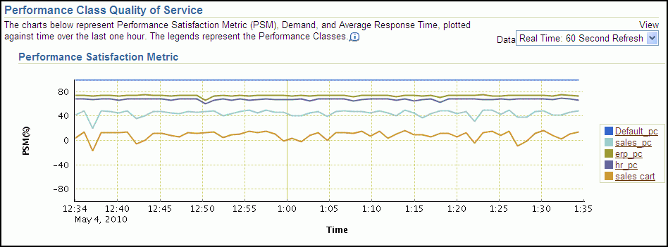 In Figure 4-1, there is no Performance Satisfaction Metric bar graph displayed for the Default_pc Performance Class because the Default_pc Performance Class is only monitored. Oracle Database QoS Management does not calculate the performance satisfaction metrics for Performance Classes that are marked as Measure Only.