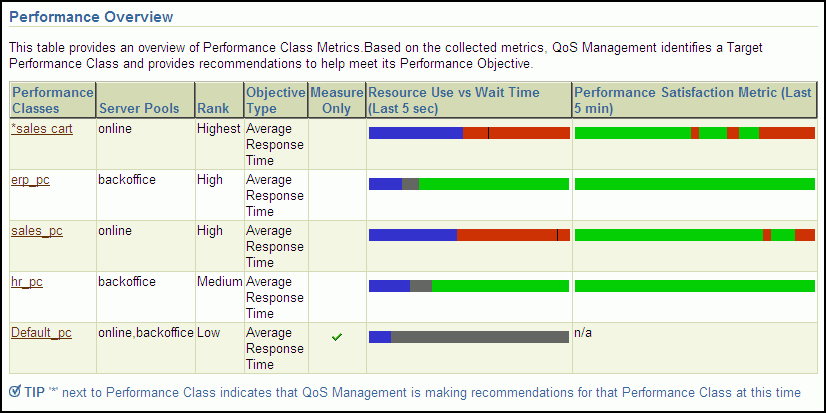 In the Performance Overview section, there is a table that lists the Performance Classes, the server pools where work is occurring, their rank, the Performance Objective being measured, and whether the Performance Objectives are being monitored only, or are being monitored and managed. For each Performance Class there are bar graphs that provide an overview of the Performance Class metrics. See "Interpreting the Performance Overview Graphs" for more information.