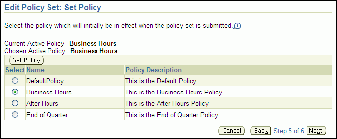 Proceed to the fifth page in the wizard, which is titled Edit Policy Set: Set Policy.