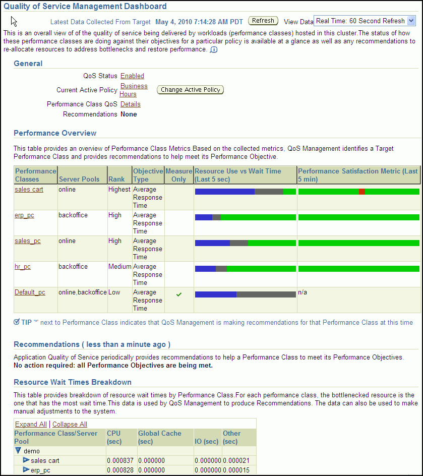 At the bottom of the Dashboard is the Resource Wait Times Breakdown table. This table provides breakdown of resource wait times by Performance Class. For each Performance Class, the bottlenecked resource is the one that has the most wait time. This data is used by Oracle Database QoS Management to produce recommendations. You can also use this data to make manual adjustments to your system.