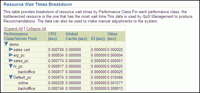 At the bottom of the Dashboard is the Resource Wait Times Breakdown section. This section contains a table that provides a breakdown of resource wait times by Performance Class. For each Performance Class, the bottlenecked resource is the one that has the most wait time. This data is used by QoS Management to produce Recommendations. The data can also be used to make manual adjustments to the system. If you expand each Performance Class listed in the table, then you can see the server pools for that Performance class, and the resource wait times for each server pool.