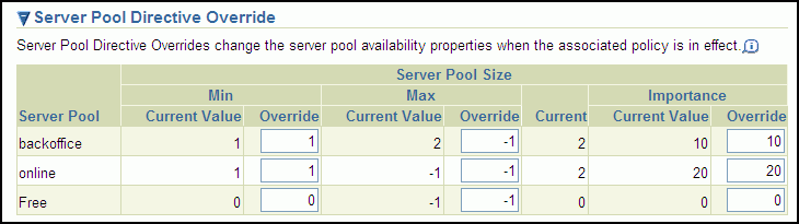 To override the current value for the minimum number of servers in a server pool, enter a new value in the Min:Override field for that server pool. Valid values are 0 to the maximum number of servers in that server pool.