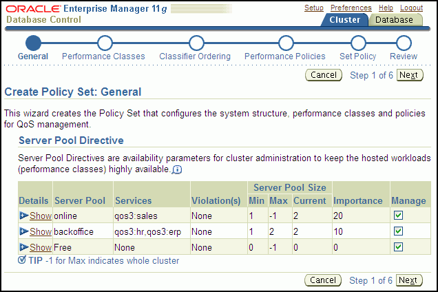 On the first page of the Create Policy Set wizard, check the Manage box next to the server pools that represent your database, for example, online and backoffice. Click Next.