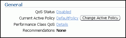On the Dashboard page, the General section shows the current status of Oracle Database QoS Management. On a new system, the status is Disabled. Click the link Disabled next to the status to enable Oracle Database QoS Management for this cluster.