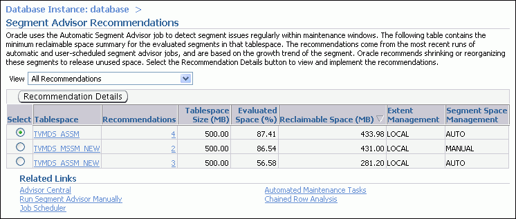 In both cases, Enterprise Manager creates the Segment Advisor task as an Oracle Database Scheduler job. You can schedule the job to run immediately, or can take advantage of advanced scheduling features offered by the Scheduler.
