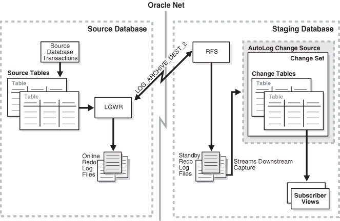 When using the AutoLog online option, the destination attribute must be LGWR ASYNC. Redo transport services copies redo data from the online redo log at the source database to the standby redo log at the staging database. Change Data Capture obtains the change data after the source database transaction commits.