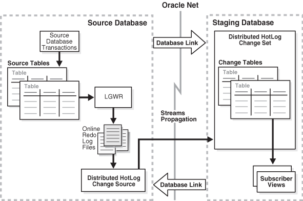 For HotLog and AutoLog modes, each change set contains a Streams capture process, queue, queue table and apply process. The staging database publisher owns all of these objects.For Distributed HotLog mode, each change source resides on the source database and contains a Streams capture process, queue and queue table. Each change set resides on the staging database and contains a Streams apply process. When the first change set in a change source is created, Change Data Capture generates a queue and queue table on the staging database to be shared among all change sets in the change source. Change Data Capture also generates a Streams Propagation on the source database from the change source queue to the change set queue on the staging database. The source database publisher owns the source database objects and the staging database publisher owns the staging database objects.