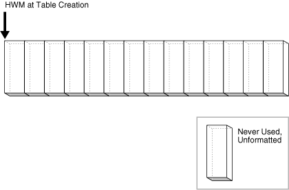 Figure 12-23 depicts an ASSM segment as a horizontal series of blocks. At table creation, the HWM is at the beginning of the segment on the left. Because no data has been inserted yet, all blocks in the segment are unformatted and never used.
