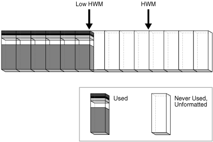 The low HWM is important in a full table scan. Because blocks below the HWM are formatted only when used, some blocks could be unformatted, as in Figure 12-25. For this reason, the database reads the bitmap block to obtain the location of the low HWM. The database reads all blocks up to the low HWM because they are known to be formatted, and then carefully reads only the formatted blocks between the low HWM and the HWM.