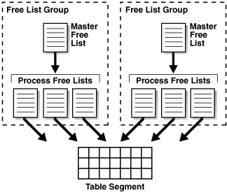As shown in Figure 12-4, you can also create an object with one or more free list groups, which are collections of free lists. Each group has a master free list that manages the individual process free lists in the group. Space overhead for free lists, especially for free list groups, can be significant.