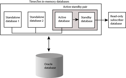 Figure 8-1 shows a cache grid. The grid has three members: two standalone IMDB Cache databases and an active standby pair with a read-only subscriber. The read-only subscriber is not part of the grid.