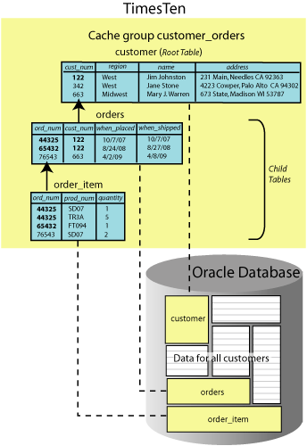 Figure 1-3 shows three tables in the customer_orders cache group. The root table is customer. orders and order_item are child tables. The cache instance identified by the row with the value 122 in the cust_num primary key column of the customer table includes: