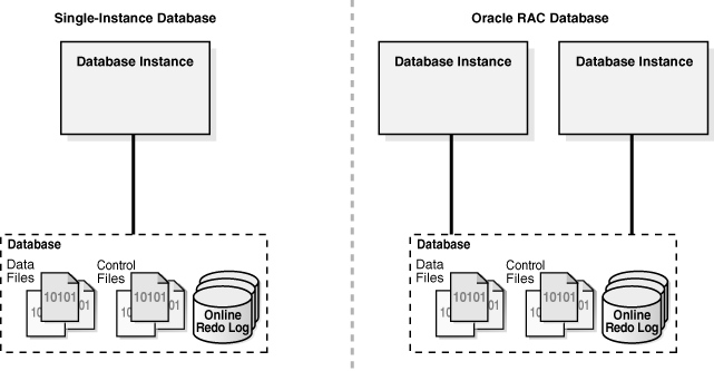In a single-instance configuration, a one-to-one relationship exists between the database and a database instance. In Oracle RAC, a one-to-many relationship exists between the database and database instances.