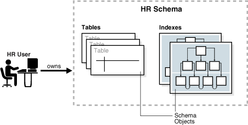 Within a schema, each schema object of a particular type has a unique name. For example, hr.employees refers to the table employees in the hr schema. Figure 2-1 depicts a schema owner named hr and schema objects within the hr schema.
