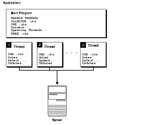 “Context Sharing Among Threads” shows an application running in a multithreaded environment. The various threads share a single runtime context to process one or more SQL statements. Again, runtime contexts cannot be shared by multiple threads at the same time. The mutexes in “Context Sharing Among Threads” show how to prevent concurrent usage.