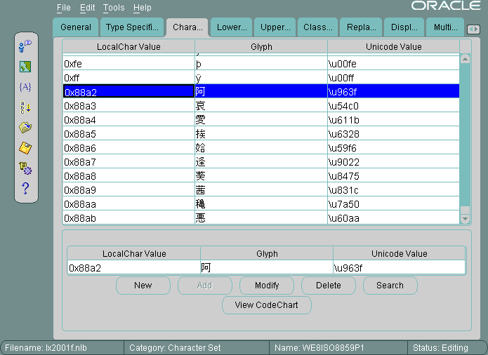 12.4 Displaying a Code Chart with the Oracle Locale Builder