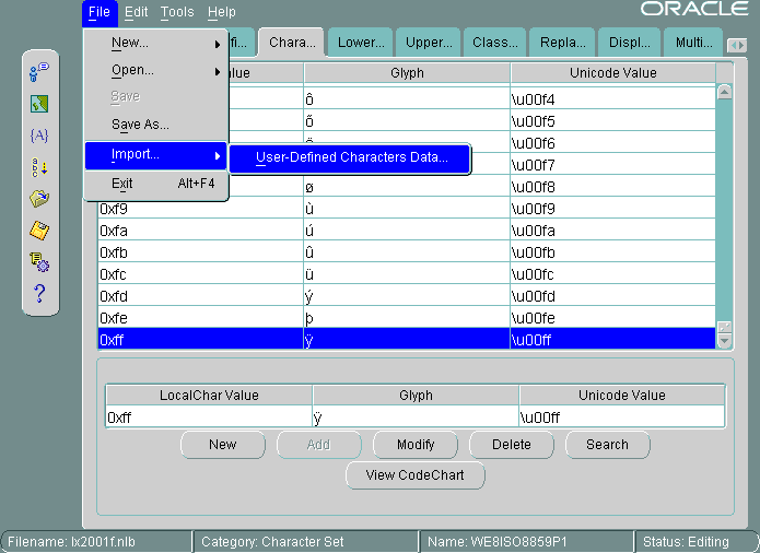 Creating a New Character Set Definition with the Oracle Locale Builder