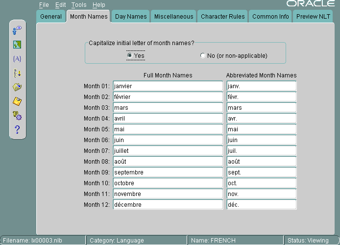 All names are shown as they appear in the NLT file. If you choose Yes for capitalization, then the month names are capitalized in your application, but they do not appear capitalized in the Month Names tab page.