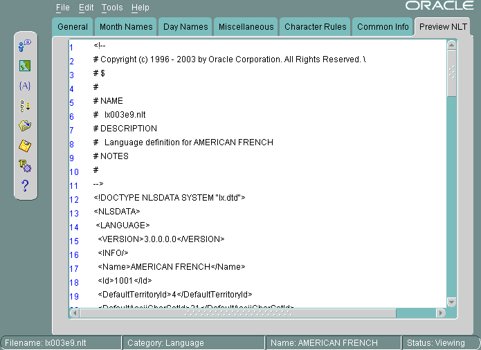 The NLT (National Language Text) file is an XML file with the file extension .nlt that stores the settings for a specific language, territory, character set, or linguistic sort. The Preview NLT tab page presents a readable form of the file so that you can see whether the changes you have made are correct. You cannot modify the NLT file from the Preview NLT tab page. You must use the specific tools and procedures available in Oracle Locale Builder to modify the NLT file.