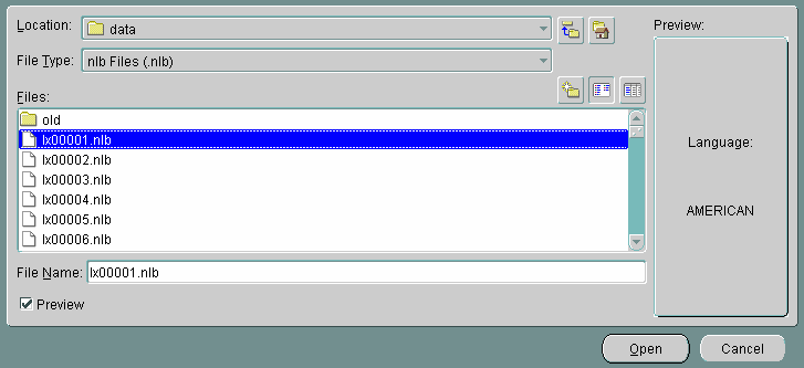 You can see the Open File dialog box by choosing File > Open > By File Name. Then choose the NLB (National Language Binary) file that you want to modify or use as a template. An NLB file is a binary file with the file extension .nlb that contains the binary equivalent of the information in the NLT file. The following screen shows the Open File dialog box with the lx00001.nlb file selected. The Preview pane shows that this NLB file is for the AMERICAN language.