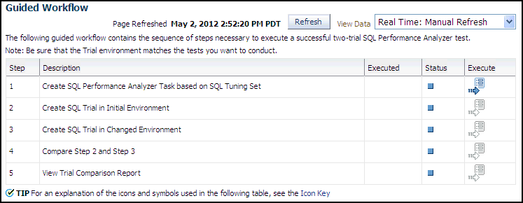 In the SQL Performance Analyzer Tasks section, the status of this task is displayed. To refresh the status icon, click Refresh. After the task completes, the Status field changes to Completed.