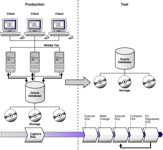 You should configure the test database environment to match the database environment of the production system as closely as possible. In this way, SQL Performance Analyzer can more accurately forecast the effect of the system change on SQL performance.