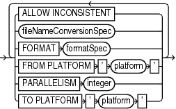 This clause specifies options for the data files, tablespaces, or database to be transported.