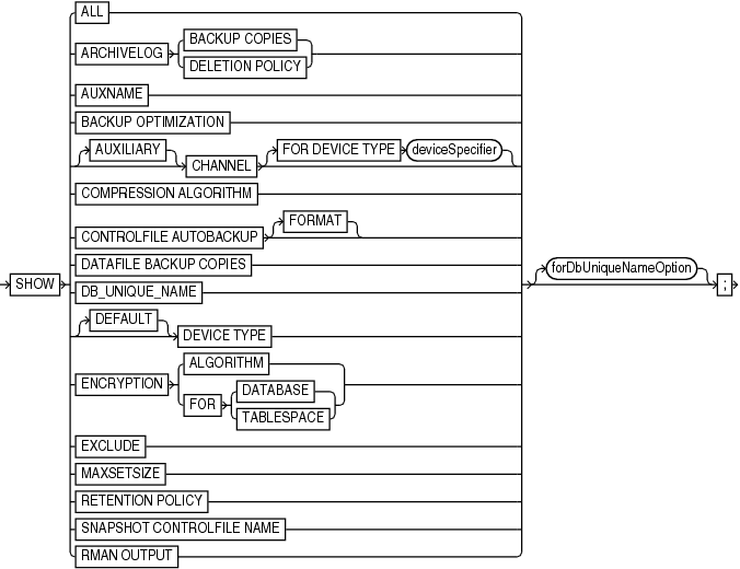 Shows the configuration in the recovery catalog for a uniquely named database even when RMAN is not connected to this database as The unique name for a database is the value of its RMAN must be connected to a recovery catalog. RMAN must be connected to a mounted target database or you must identify the target database with See Also: |