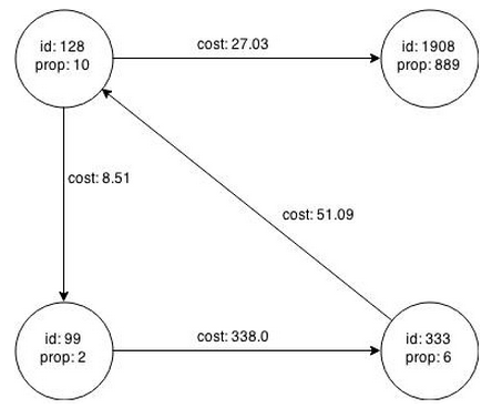 The following figure shows the data rendered as a property graph with 4 vertices and 5 edges. (There are two edges between vertex 2 and vertex 4, each pointing in a direction opposite form the other.)