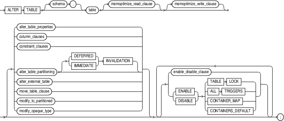 (physical_attributes_clause::=, logging_clause::=, table_compression::=, inmemory_table_clause::=, ilm_clause::=, supplemental_table_logging::=, allocate_extent_clause::=, deallocate_unused_clause::= , upgrade_table_clause::=, records_per_block_clause::=, parallel_clause::=, row_movement_clause::=, flashback_archive_clause::=, shrink_clause::=, attribute_clustering_clause::=, clustering_when::=, zonemap_clause::=, alter_iot_clauses::=, alter_XMLSchema_clause::=)