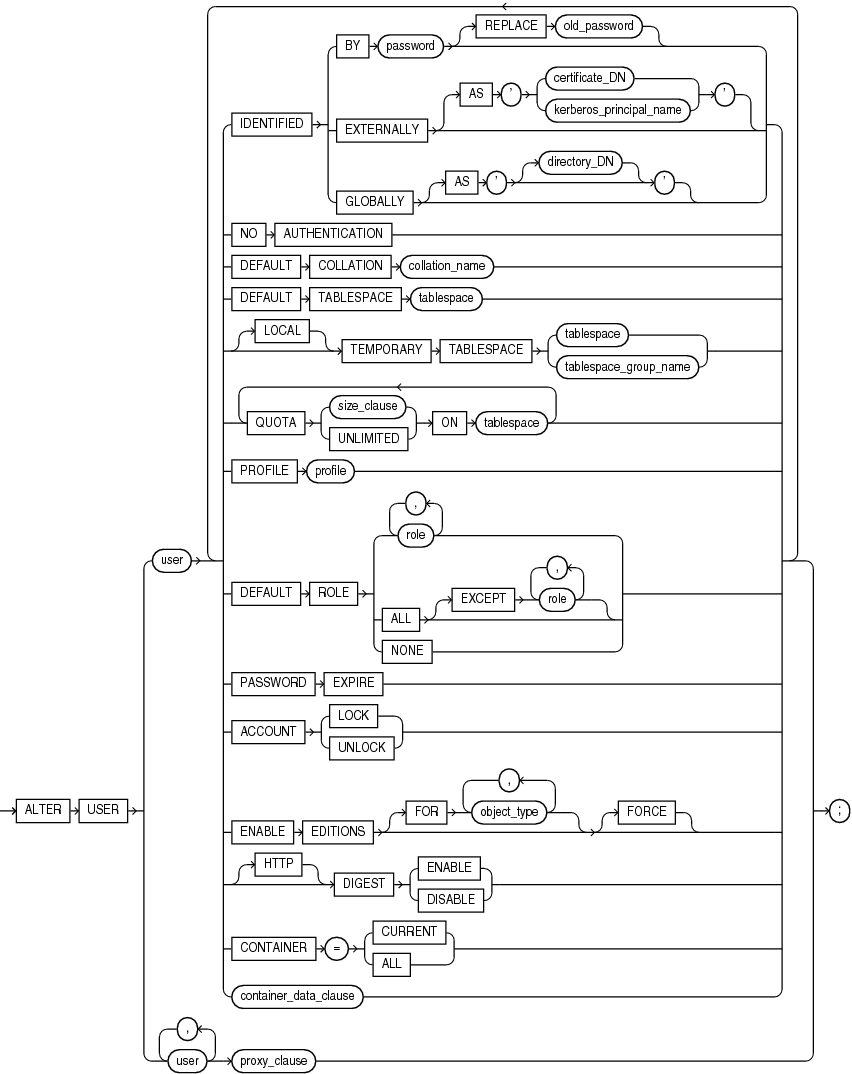 ENABLEto enable HTTP Digest Access Authentication. After you specify this clause, the user’s password must be changed. This causes the database to generate an HTTP Digest verifier for the new password. Only then will HTTP Digest Access Authentication take effect. One way to ensure that the user’s password is changed after you issue this clause is to specify thePASSWORDEXPIREclause in the same statement with theHTTPDIGESTENABLEclause, as follows:ALTER USER user PASSWORD EXPIRE HTTP DIGEST ENABLE;This causes the database to prompt the user for a new password on his or her next attempt to log in to the database. After that, HTTP Digest Access Authentication will take effect for the user.
