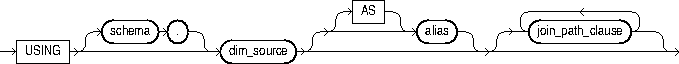 With the USING keyword, specify a table or view. You may specify an alias for the table or view by using the AS keyword. Optionally, you may specify a join path. Use join paths to specify joins when the attribute dimension uses tables organized in a snowflake schema.