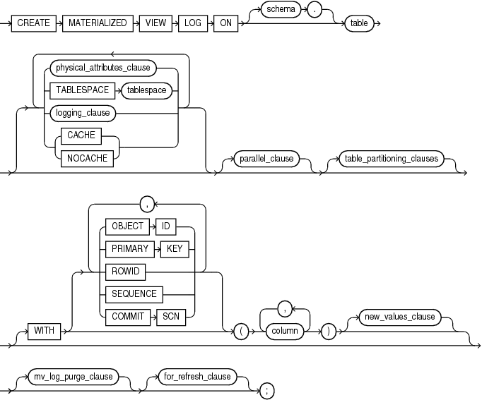 (physical_attributes_clause::=, logging_clause::=, parallel_clause::=, table_partitioning_clauses::= (in CREATE TABLE), new_values_clause::=, mv_log_purge_clause::=, for_refresh_clause::=.)