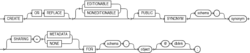 If you omit this clause, then the database uses the value of the DEFAULT_SHARING initialization parameter to determine the sharing attribute of the synonym. If the DEFAULT_SHARING initialization parameter does not have a value, then the default is METADATA.