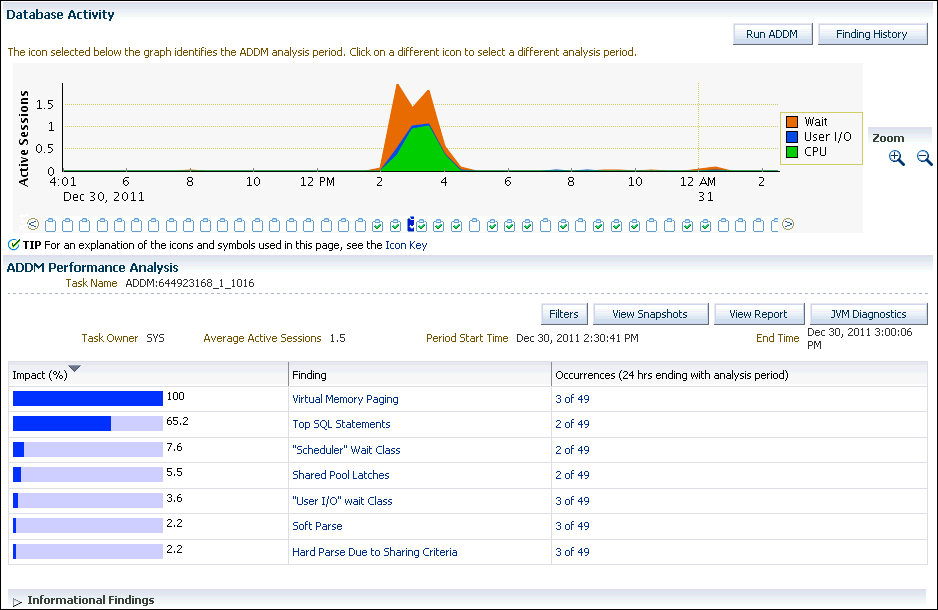 Description of "Figure 3-1 The Automatic Database Diagnostic Monitor Page"On the Automatic Database Diagnostic Monitor (ADDM) page, the Database Activity chart shows the database activity during the ADDM analysis period. Database activity types are defined in the legend based on their corresponding colors in the chart. Each icon below the chart represents a different ADDM task, which in turn corresponds to a pair of snapshots saved in AWR.