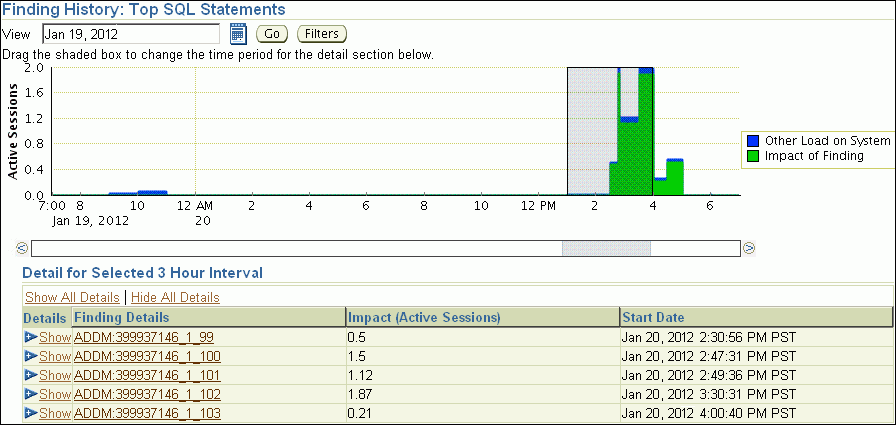 To view details about a finding, under Detail for Selected 3 Hour Interval, click the link in the Finding Details column to display the Performance Finding Details page for the corresponding ADDM finding.