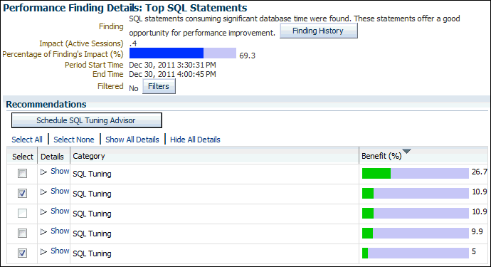In the following screen shot of the Performance Finding Details page, five recommendations are shown. The first is estimated to have a maximum benefit of up to 26.7% of DB time in the analysis period. The second recommendation is estimated to have a maximum benefit of up to 10.9% of DB time, the third also has a maximum of 10.9%, the fourth has a maximum of 9.9%, and the fifth has a maximum of 5%.