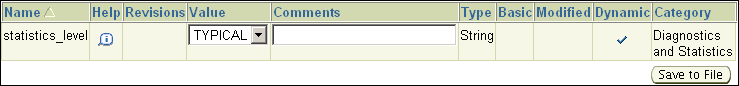 TYPICALorALLin the Value list for thestatistics_levelparameter. Click Save to File to set the value in the server parameter file.In the following screenshot of the Initialization Parameters table, the default value of Typical is used.