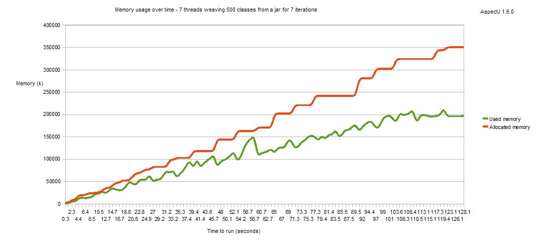 As well as addressing the memory usage of a single load time weaver, we have also looked at the use of load time weaving in a larger scale scenario, where multiple classloaders are being instantiated and discarded over time and each has an associated load time weaver. Under bug 210470 we looked in detail at whether the lifecycle of the weaver instance correctly matched the lifecycle of the associated classloader. It did not, but now it does! Here is a memory usage graph for AspectJ1.6.1 - this shows an application that spawns 7 threads which run continuously for a few minutes. Each thread repeatedly creates a classloader, weaves 500 classes using it then discards the classloader. You can see that over time the memory is recovered correctly and when all threads complete (and all classloaders are orphaned), all the weavers are discarded.