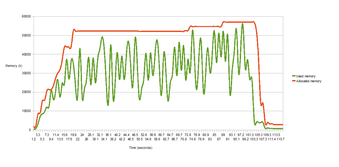 The refactoring work has also reduced the amount of unnecessary garbage created on the heap during the weaving process. The next comparison shows roughly the reduction in amount of 'stuff' created on the heap during a weave. This isn't the max heap required to do a weave, it is just showing how many less temporary objects are allocated during an entire run of the weaver