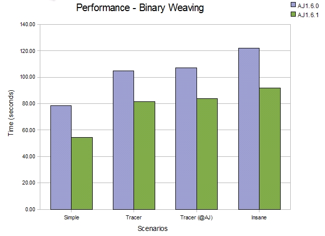 The main themes of AspectJ1.6.1 are better memory usage and faster weaving. This has been achieved through profiling of the weaving process and has resulted in some serious refactoring of the weaver component within AspectJ. It provides exactly the same functionality as in previous releases, it just weaves faster now, using less code and less memory. This readme will give an overview of the kind of changes made and what can be expected when using 1.6.1 compared to previous releases.
