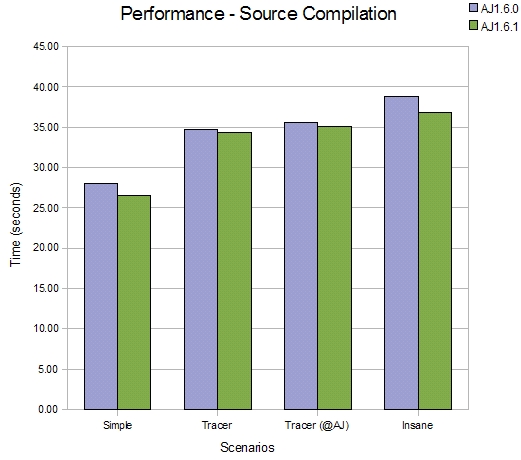 The refactoring effort has been focused on the weaver component, hence there is limited impact on the performance of source compilation but this comparison shows it is faster. Four scenarios are compared, in each scenario a different aspect is applied to the JDT compiler (just as a sample piece of source code).