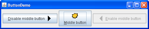 As the ButtonDemo example shows, a Swing button can display both text and an image. In ButtonDemo, each button has its text in a different place, relative to its image. The underlined letter in each button's text shows the mnemonic the keyboard alternative for each button. In most look and feels, the user can click a button by pressing the Alt key and the mnemonic. For example, Alt-M would click the Middle button in ButtonDemo.