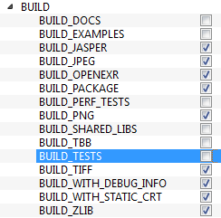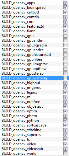Remaining fields specify what modules are to be built. Since GPU modules are not yet supported by OpenCV-Python, you can completely avoid it to save time (But if you work with them, keep it there). See the image below: