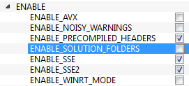 Now click on ENABLE field to expand it. Make sure ENABLE_SOLUTION_FOLDERS is unchecked (Solution folders are not supported by Visual Studio Express edition). See the image below: