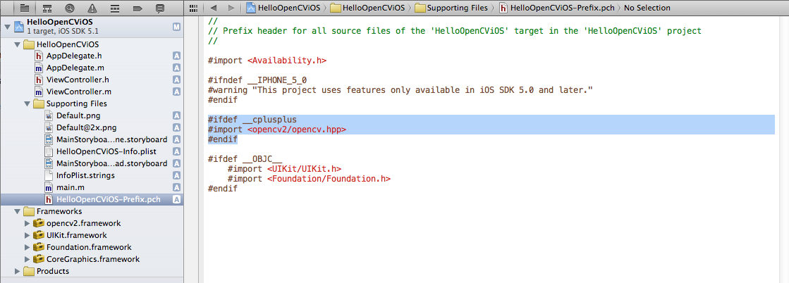 - Open the file named NameOfProject-Prefix.pch ( replace NameOfProject with name of your project) and add the following lines of code.