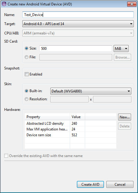 Create new Android Virtual Device window will let you select some properties for your new device, like target API level, size of SD-card and other.