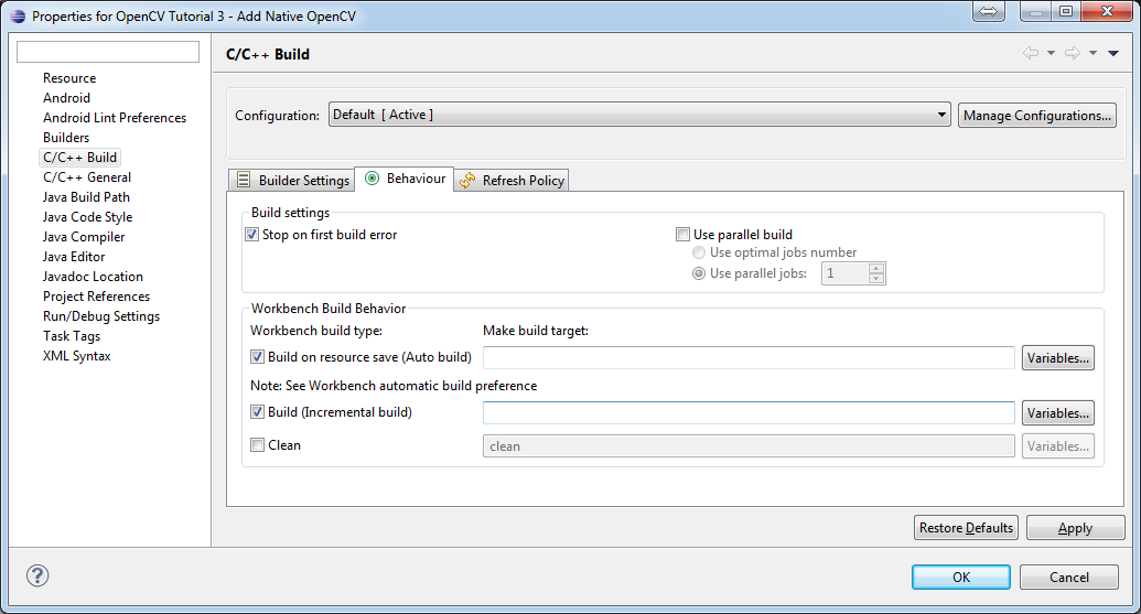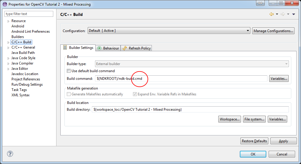 OpenCV for Android package since version 2.4.2 contains sample projects pre-configured CDT Builders. For your own projects follow the steps below.